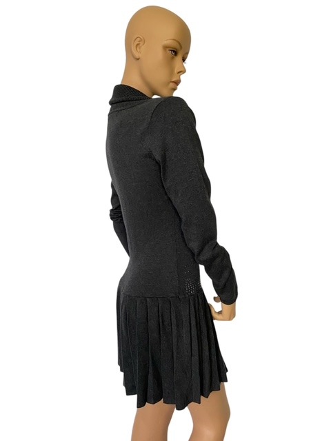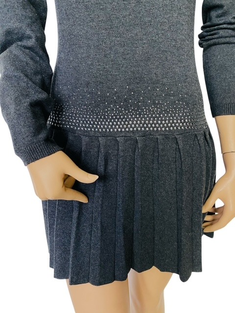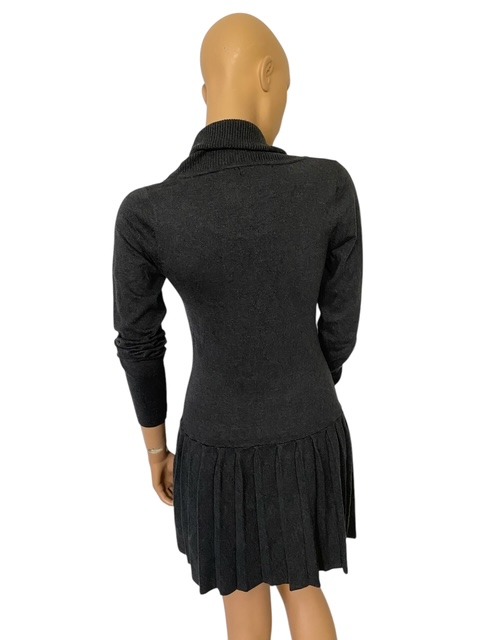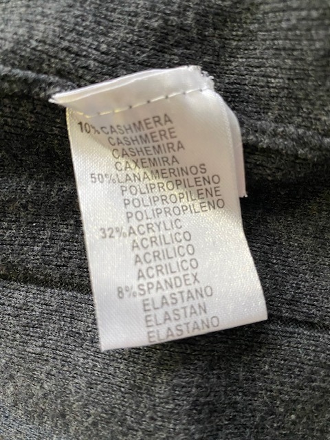 10% cashmere, 50% wol, 32% acryl & 8% spandex – ruglengte = 86 cm – zilverkleurige versiering voorkant jurk – okselbreedte = 44 cm, label geeft aan maat M/L, maar jurk valt klein