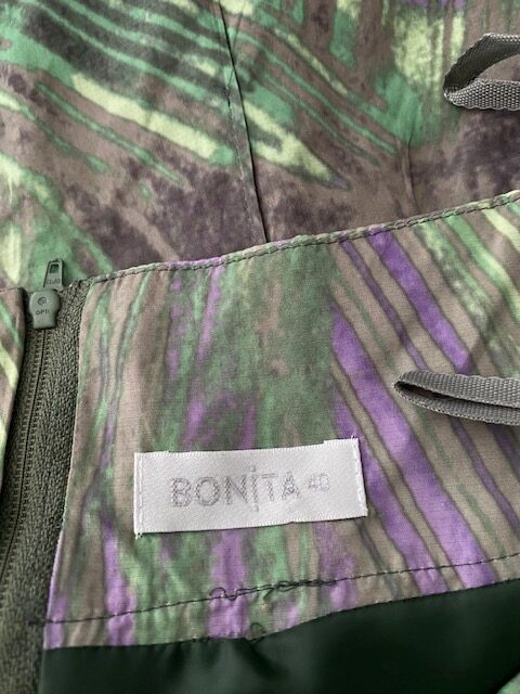 polyester – gevoerd – los strikkoordje – rits in achterpand – tailleomvang = 83 cm – roklengte = 64 cm