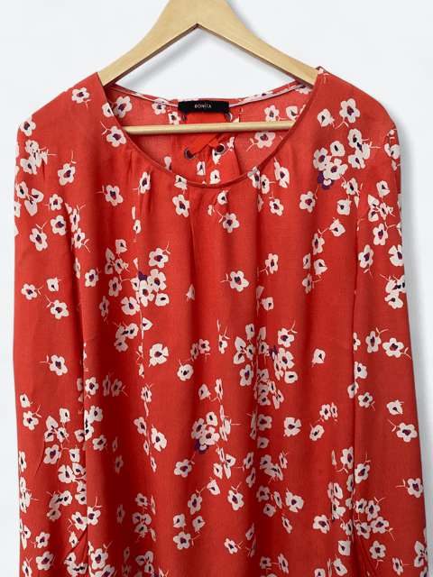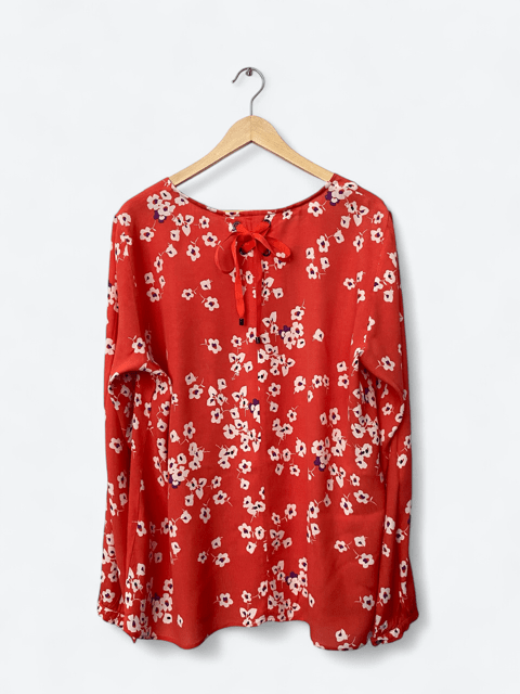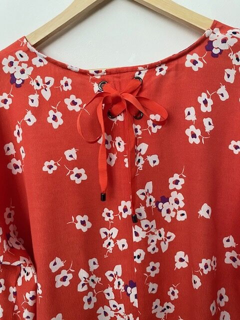 leuk accentje op rug – ruglengte = 65 cm – okselbreedte = 64 cm – kleur is oranje/rood – was/maat label is verwijderd: maat 44/46 – polyester