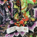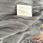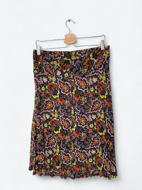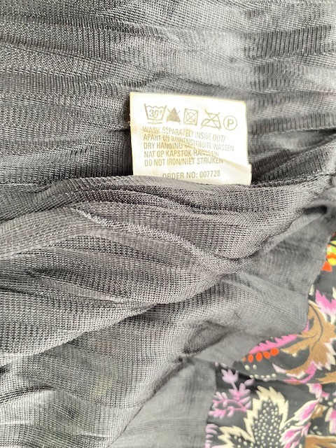 rits in achterpand – zwarte binnenrok – taille-omvang = 89 cm – roklengte = 69 cm – 100% polyester – label geeft aan maat 42, maar rok valt klein