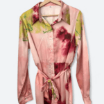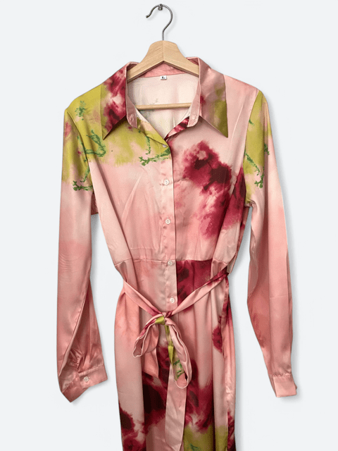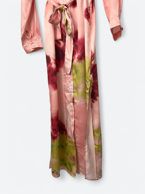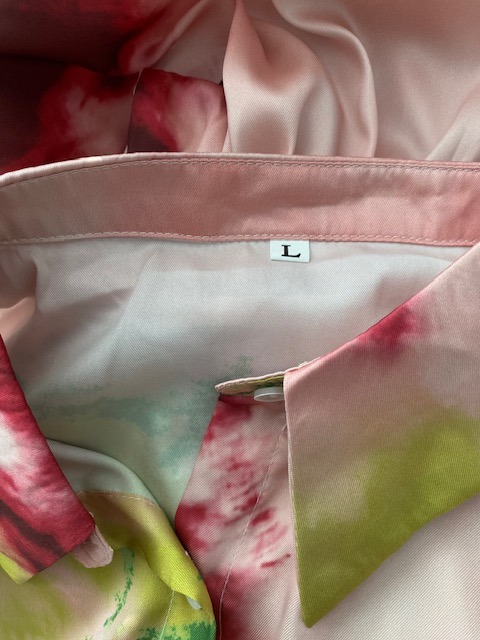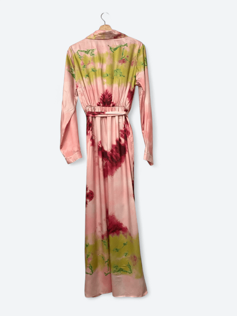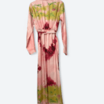 100% polyester – losse strikband – ruglengte = 144 cm – hoge split in zijnaden – dunne elastiek in taille – okselbreedte = 57 cm – manchet met knoopje